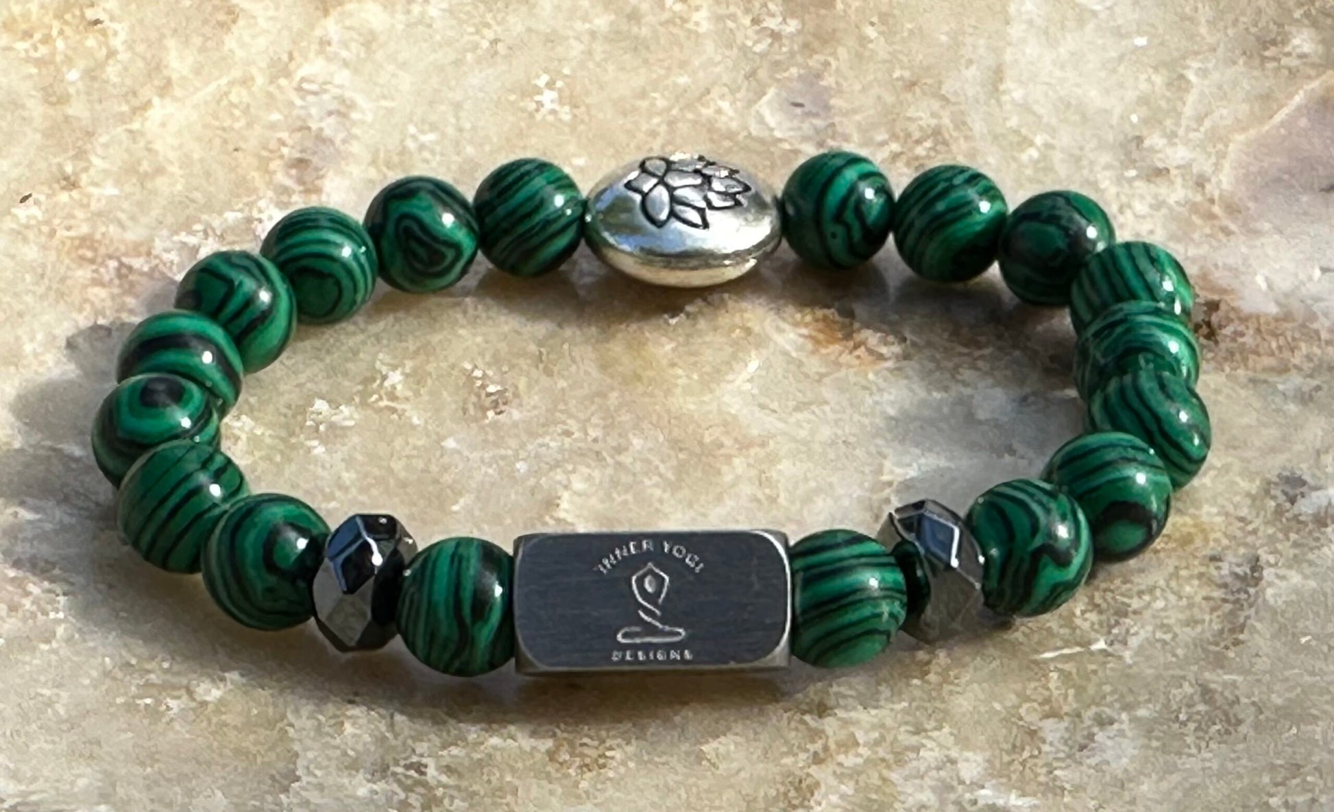 The Enchanting Balance Bracelet: An exquisite fusion of reconstituted Malachite and Hematite, meticulously crafted to embody the metaphysical dance of transformation, protection, and unwavering balance. Malachite, a vivid green enchantress, guides your spirit through transformative journeys, encouraging growth and healing.