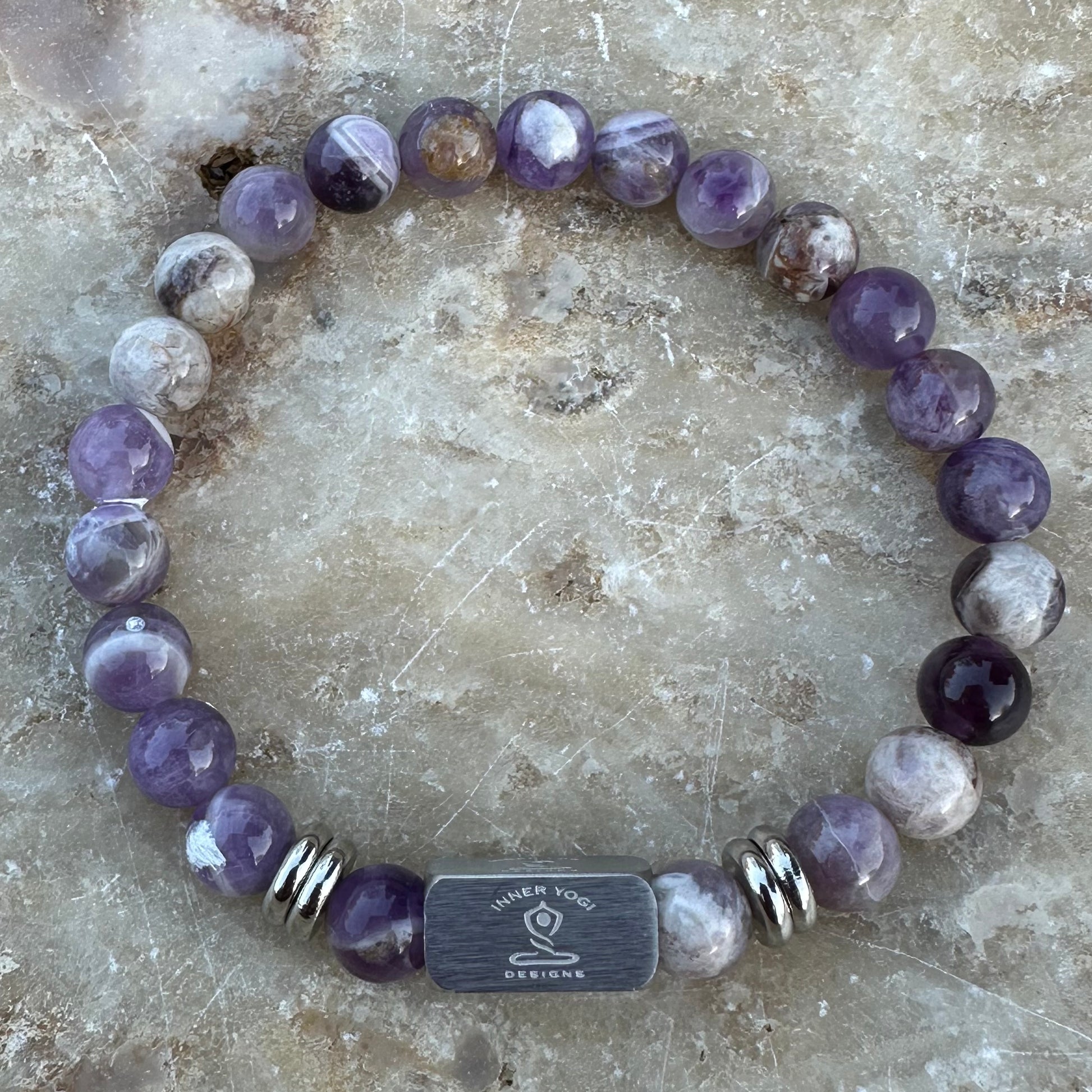 All bracelets are strung on a high quality elastic cord with an 8mm Inner Yogi Designs logo bead is stainless steel. Bracelets may vary slightly due to stones uniqueness.