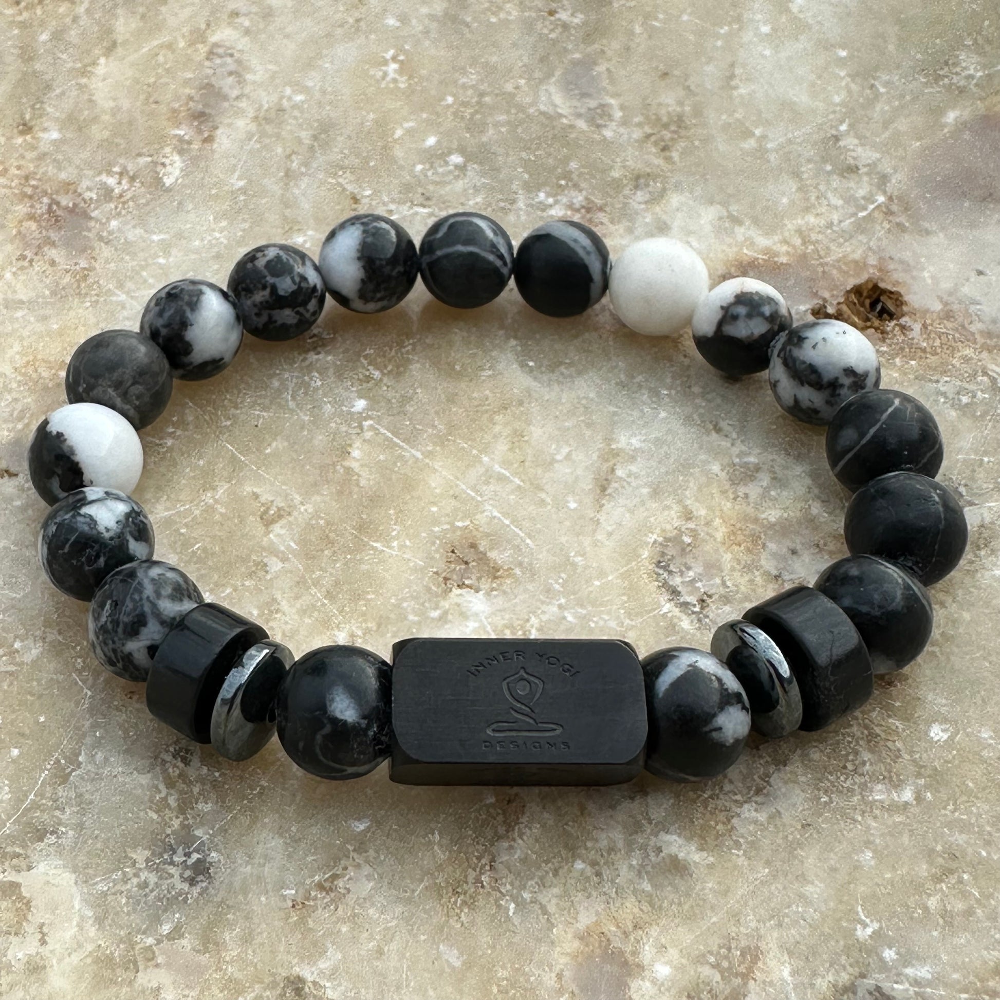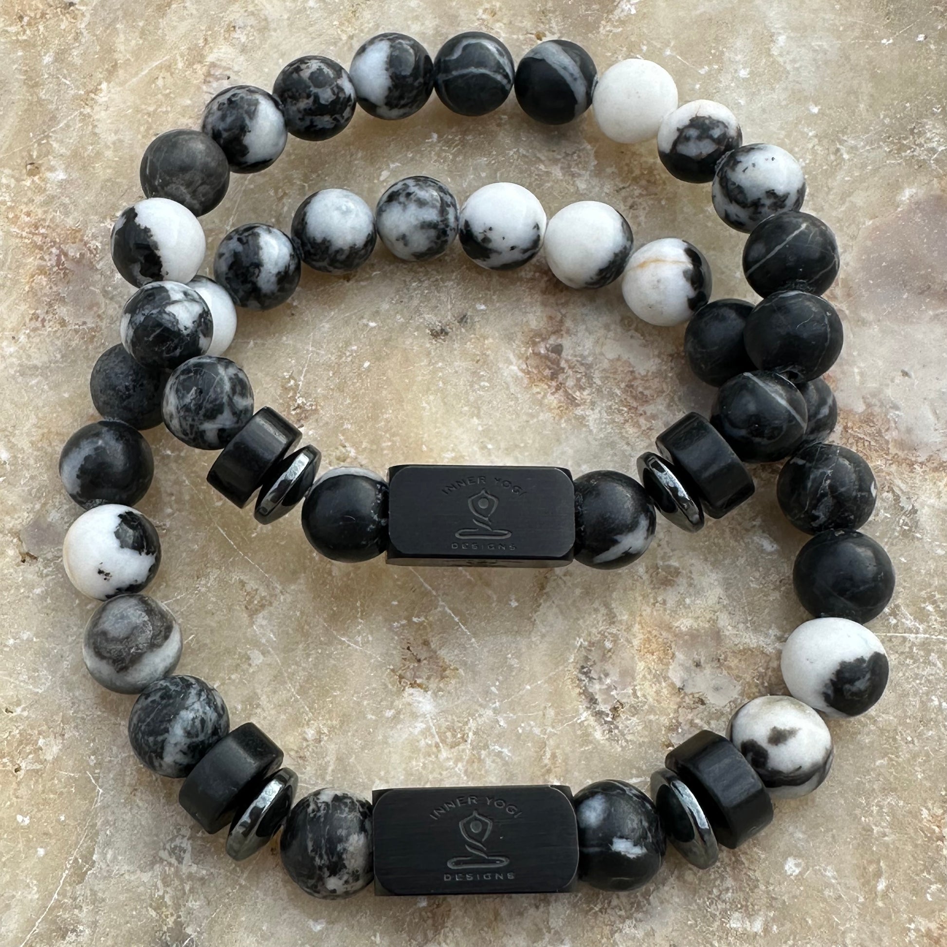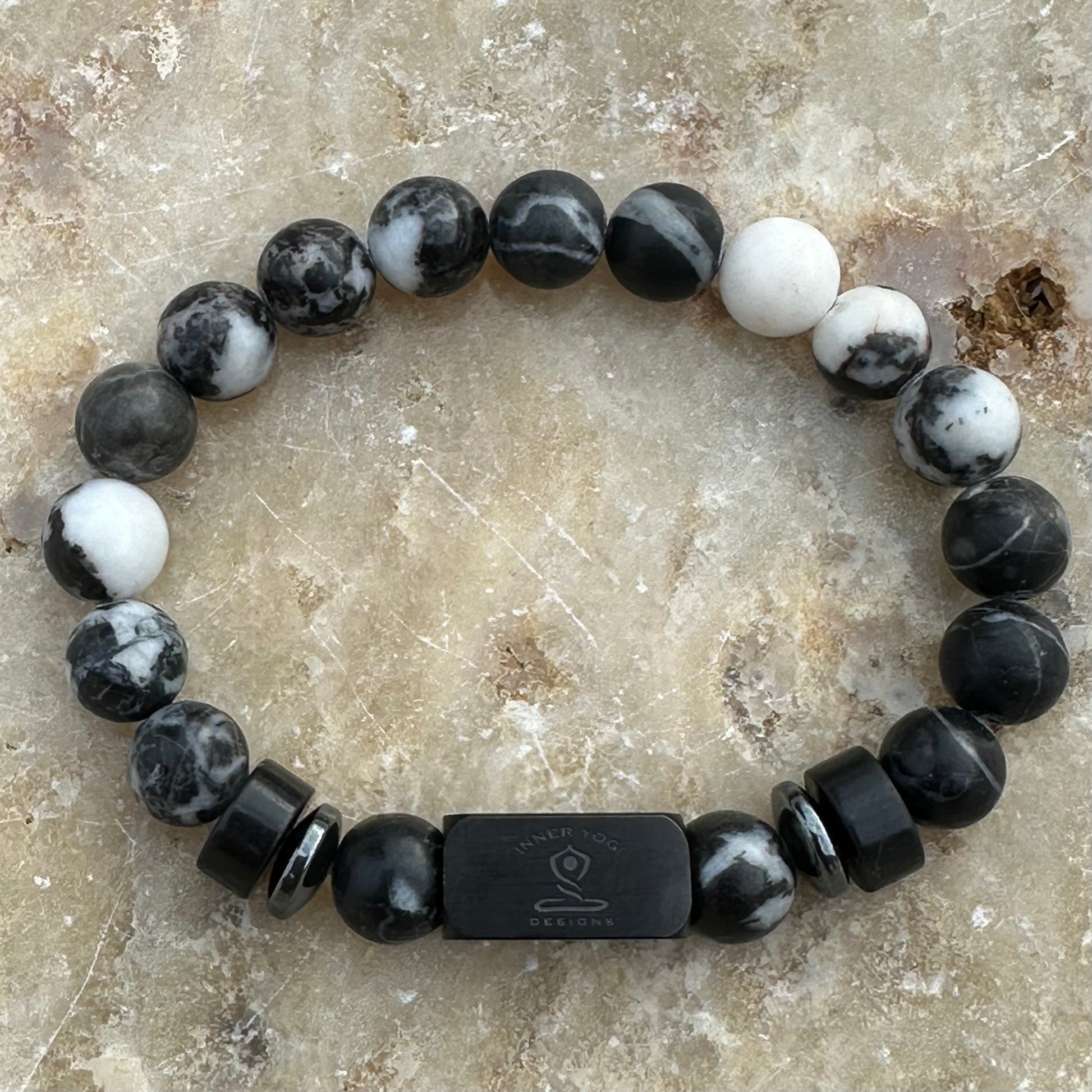 This design features black jasper, zebra stone, hematite, and an Inner Yogi Designs stainless steel logo bead. Stones may vary slightly in color and pattern due to the uniqueness of each stone. All bracelets are strung on a high quality elastic cord with an 8mm Inner Yogi Designs logo bead is stainless steel.